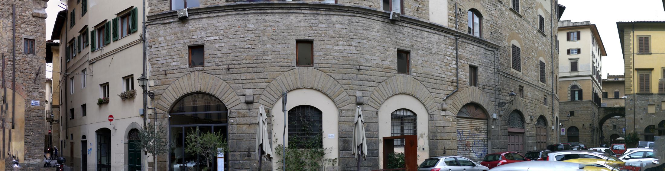 Schaut man sich den Stadtplan bzw. Luftaufnahmen von Florenz an, fällt inmitten der einigermaßen geraden Straßen eine Struktur südöstlich vom Zentrum auf. Vier Straßen bilden hier zusammen ein Dreivierteloval, zwei Straßen schneiden dieses und münden in die Piazza di Santa Croce.