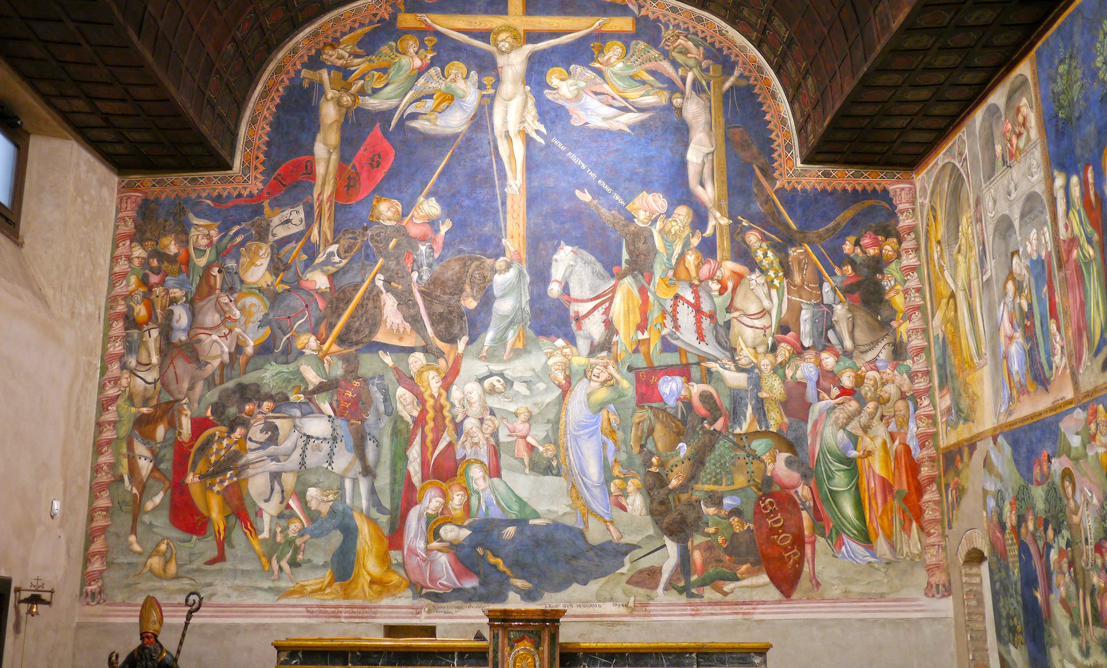 Nachdem wir durch die Besichtigung größtenteils das Unwetter abgepasst hatten, schauten wir uns noch das Oratorio di San Giovanni mit den beeindruckenden, aber etwas grotesken Fresken der Gebrüder Salimbeni an und machten uns dann auf den Rückweg.
